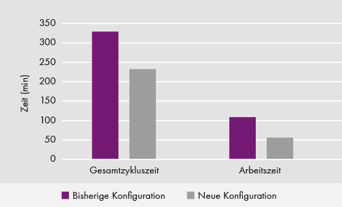 Abbildung 1: Gesamtzykluszeit und direkte Laborzeit für eine Standardcharge aus 51 Patientenproben und 4 Qualitätskontrollen