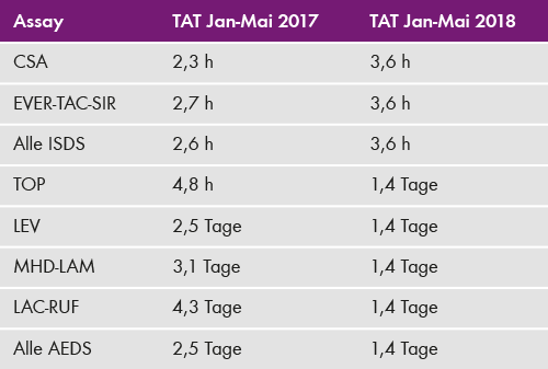 Tabelle 1: Vergleich der Gesamtanalysezeit (TAT) von alle ISDS und AEDS im ersten Semester 2017 und 2018.
