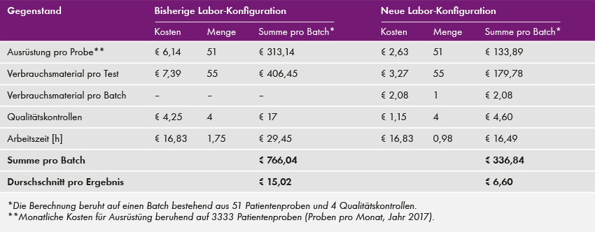Die Autoren konnten also nachweisen, dass die Analyse schneller und für das Personal weniger zeitaufwendig war. Sie untersuchten weiter, ob diese Verbesserungen mit einer Reduktion der Gesamtkosten einhergingen und analysierten die Kosten für eine Standardcharge aus 51 Proben und 4 Qualitätskontrollen bei der Immunsuppressiva-Prüfung. Durch die Automatisierung und Verschlankung der Methodik auf die LC-MS gelang es dem Labor, eine 50-prozentige Kostensenkung bei der Immunsuppressiva-Prüfung zu erzielen (s. Tabelle 2).
