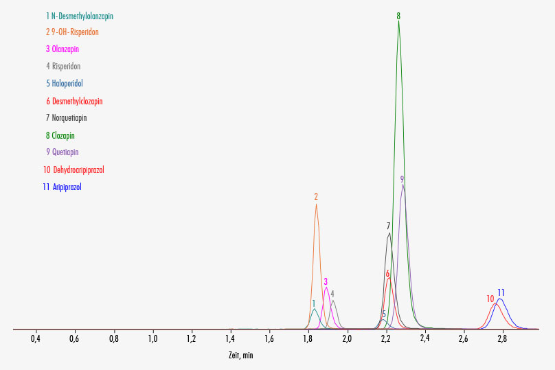 Dieses Parameter-Set ermöglicht die quantitative Bestimmung von Aripiprazol, Dehydroaripiprazol, Clozapin, Desmethylclozapin, Haloperidol, Olanzapin, N-Desmethylolanzapin, Quetiapin, Norquetiapin, Risperidon and 9-OH-Risperidon in humanen Serum oder Plasmaproben mit LC-MS/MS.